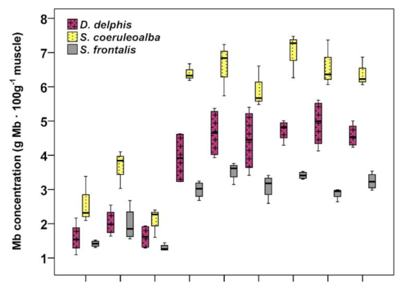 L’autre résultat nouveau de cette étude est la mise en évidence d’une concentration en myoglobine nettement plus forte dans les muscles locomoteurs, comparé aux autres muscles (pectoraux, …). La myoglobine se trouve donc bien concentrée dans les muscles les plus consommateurs d’oxygène, ceux qui servent à nager.
