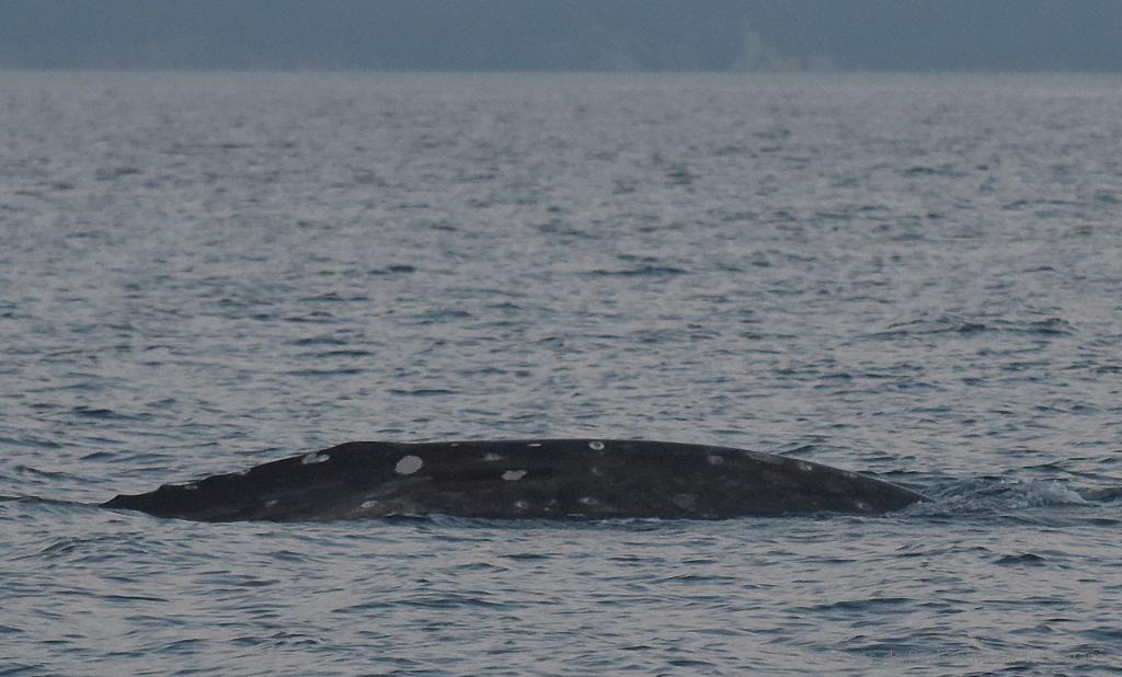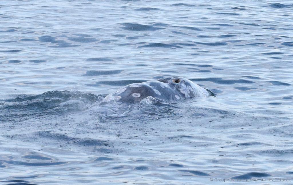 Nos collègues italiens nous avaient annoncé son arrivée lancé à environ 3,5 nœuds (c’est la vitesse normale des Baleines grises dans leurs conditions habituelles), mais lorsque nous l’avions escorté près du Cap Bénat, il n’avançait qu’à à peu près 2,5 nœuds… ce qui est déjà pas mal !