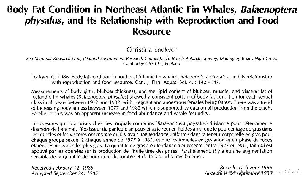 - Lockyer C., 1986. Body fat condition in northeast Atlantic fin whales, Balaenoptera physalus, and its relationship with reproduction and food resource. Canadian Jour of Fish and Aquatic Sci. 43:142-147.