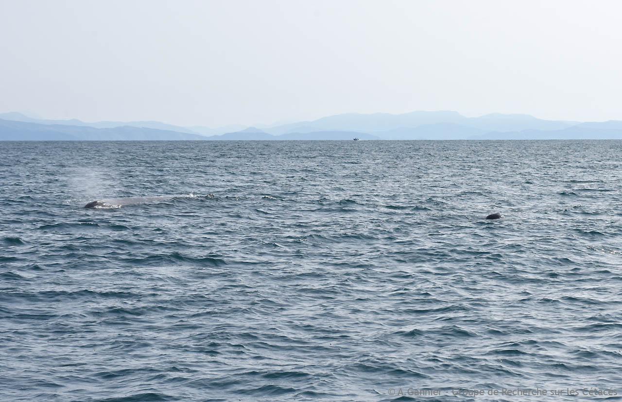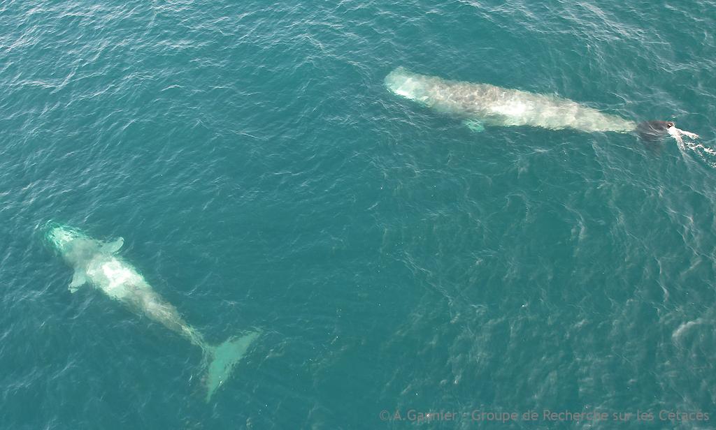 L’observation aérienne a été très utile car elle nous a permis de mesurer approximativement la taille des deux individus : le premier faisait environ 11 mètres, et le second un peu moins. Il s’agissait donc de deux mâles subadultes, mais pas les mêmes que ceux que nous avons identifiés en 2021.
