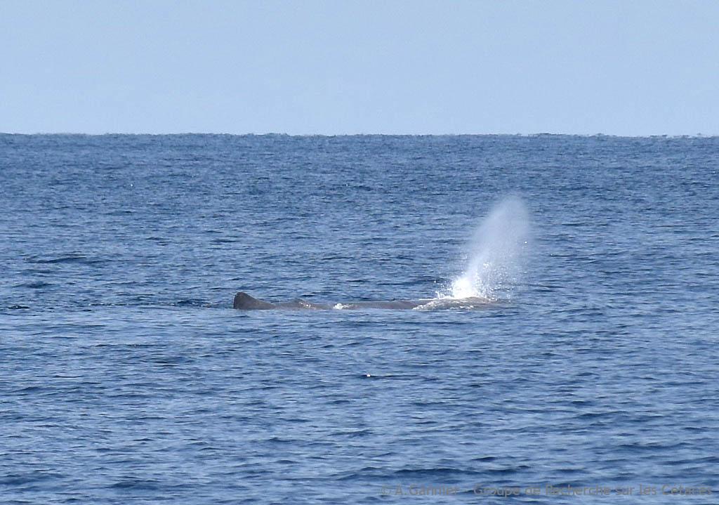 Au hasard de nos navigations en zone basque, nous avons détecté de loin quelques cachalots. Au bout d’une heure, nous nous sommes trouvés à proximité d’un premier puis d’un deuxième individu, que nous avons localisé lors de sa séquence de souffles.