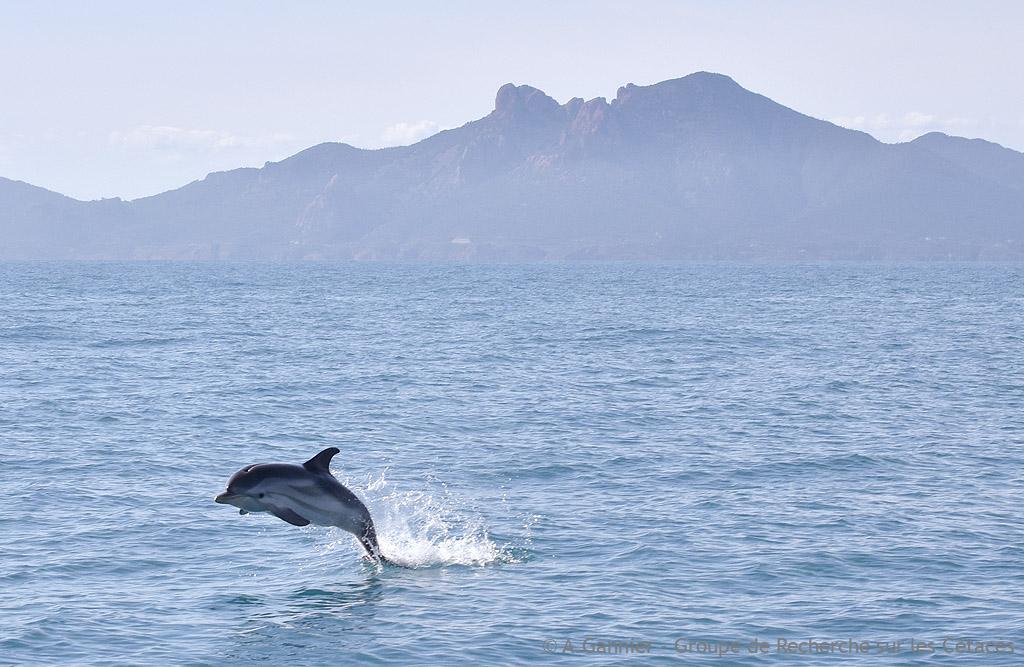 Pour ce qui est de l’effort de prospection du Groupe de Recherche sur les Cétacés en zone azuréenne depuis plus de trente ans, il se concentre majoritairement entre le Cap Dramont et le Cap Ferrat : cette Côte d’Azur « centrale », essentiellement située sur le Sud-ouest des Alpes-Maritimes, constitue un environnement riche d’intérêt, puisqu’elle comprend les trois canyons les plus abrupts de la région (canyons de La Napoule, du Var et de Villefranche) mais aussi des zones moins profondes (plateau reliant le golfe Juan aux îles de Lérins, pente Est du Cap d’Antibes, haut-fond du Méjean, notamment)… mais la présence d’aires urbaines très touristiques comme Nice, Cannes ou Saint-Raphaël implique malheureusement une forte pression anthropique sur le milieu, qui a donc bien besoin de mesures de protection énergiques afin de conserver son attractivité pour la vie sauvage et les cétacés.