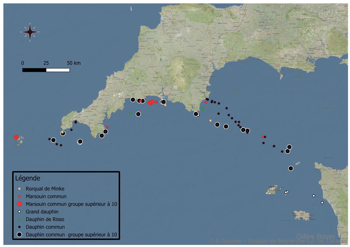 Au total 70 observations de cétacés ont été faites, dont trois depuis la terre ferme et deux au mouillage.