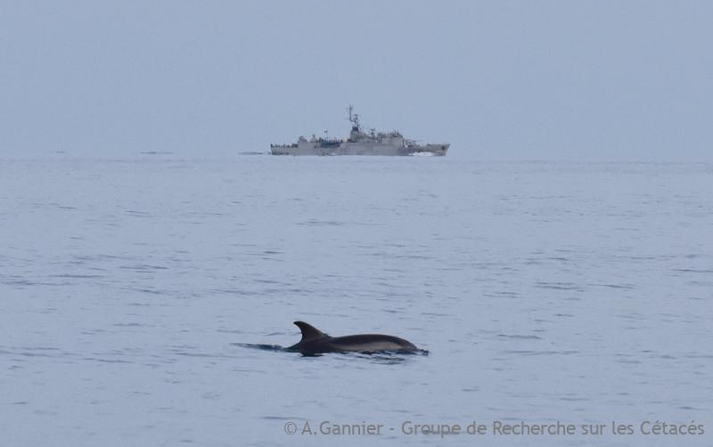 Une météo calme, des dauphins peu nombreux, en chasse, et non perturbés (l’aviso F795 loin en arrière plan ne les dérange pas)… et on tente sa chance