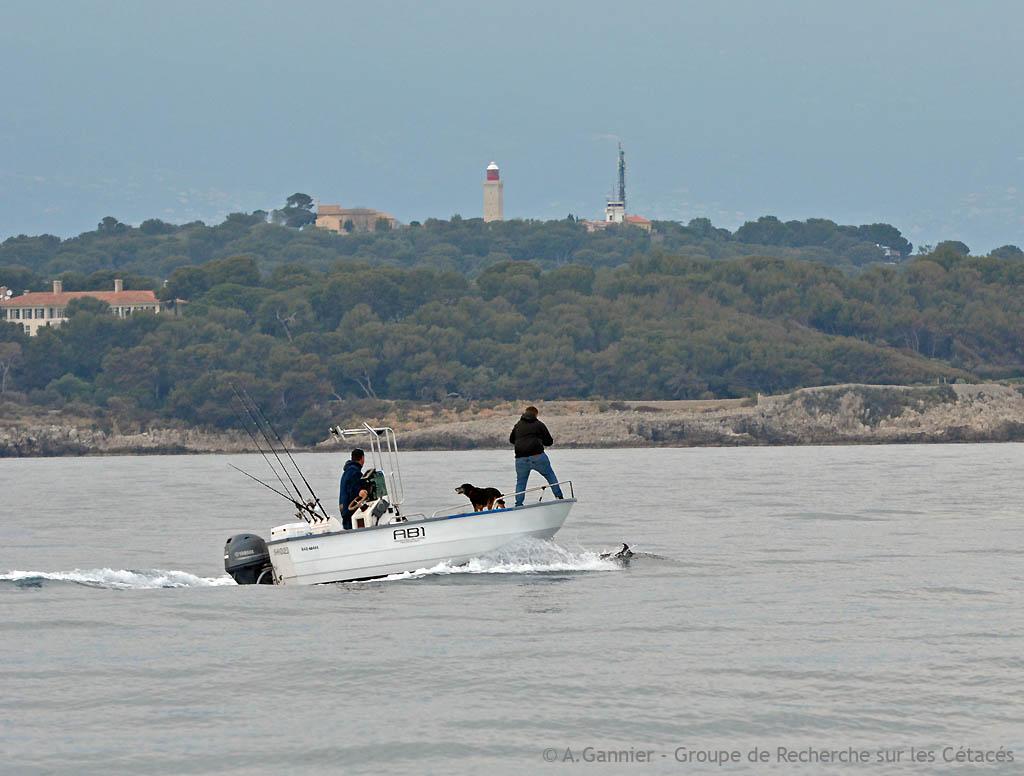 Vers la fin d’après-midi, alors que les dauphins se sont rapprochés du haut du talus pour chercher leur nourriture, une autre occasion nous est donnée de consigner ce genre d’interactions : un canot de pêcheurs se précipite sur le groupe de dauphins, et entame une partie de rodéo ‘pour se faire plaisir’. Heureusement, cette séance ne dure que 7 minutes… mais elle vient quand même perturber notre étude puisque dans ce laps de temps, les dauphins sont passés à la phase ‘prédation’ de leur cycle journalier. De ce fait, ils se sont dispersés sur une grande surface et enchaînent sondes et séquences de respiration…