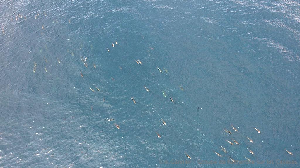 Nous croisons de nombreux groupes de Dauphins communs au cours de nos navigations dans la région basque : cette espèce est très largement la plus répandue en zone sud-Gascogne, tant sur le plateau qu’en zone profonde. Les groupes rencontrés ont un effectif très variable, de la dizaine d’individus jusqu’à plusieurs centaines.