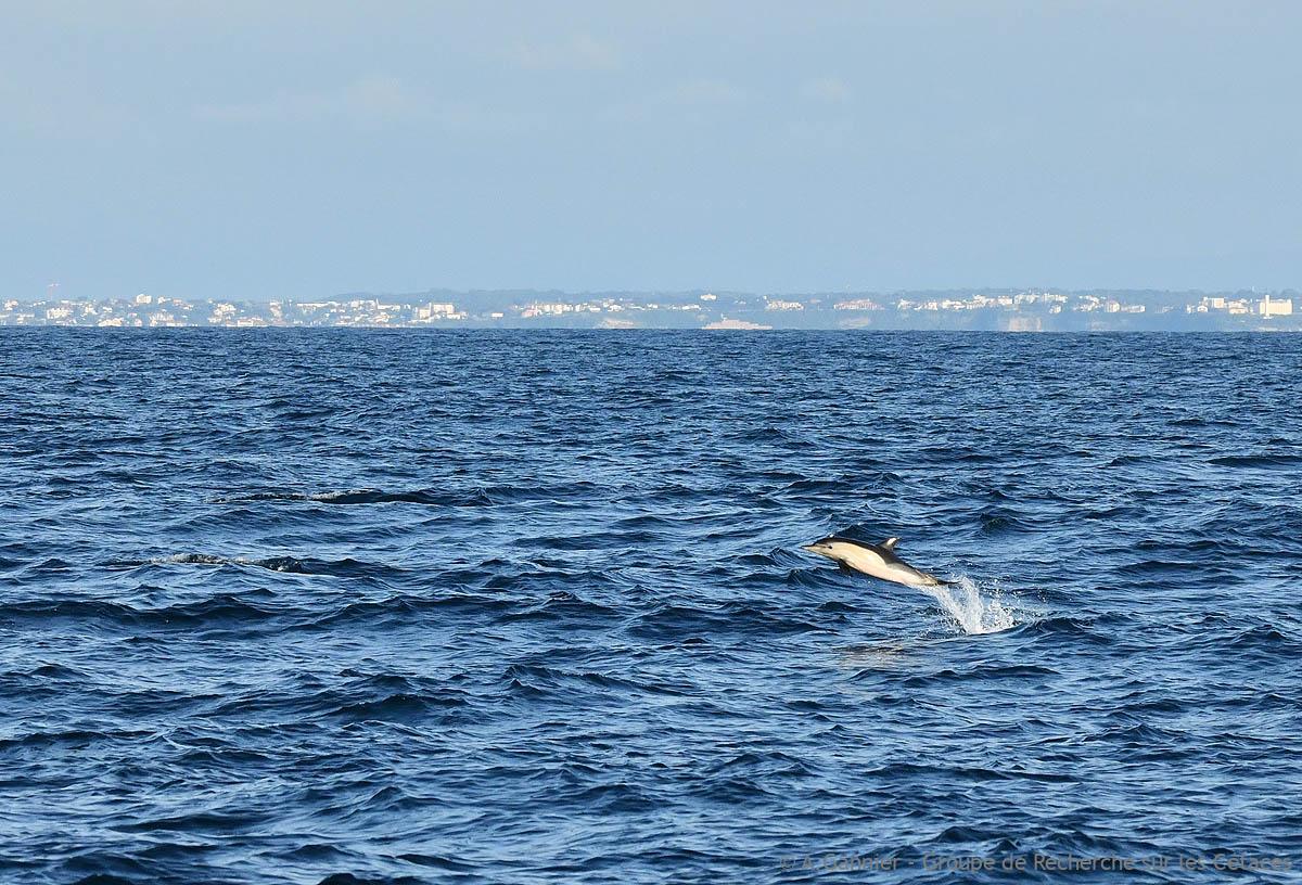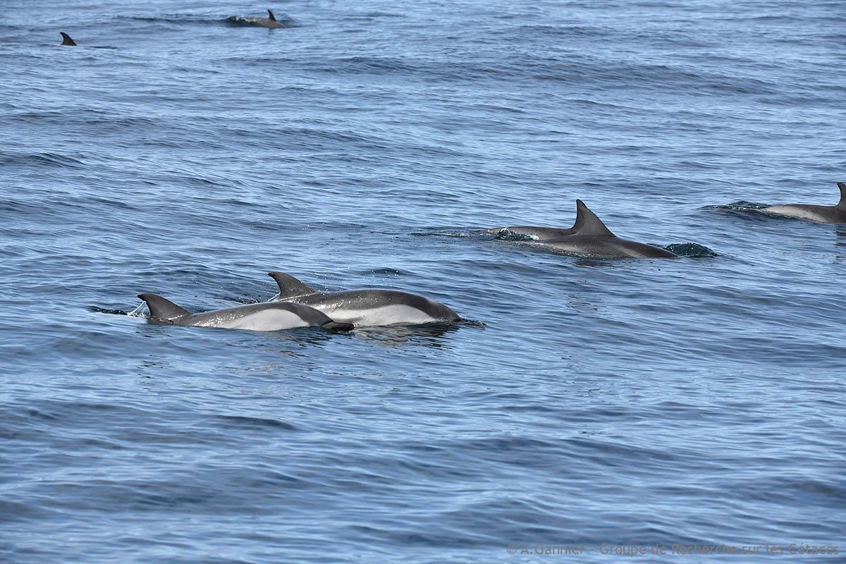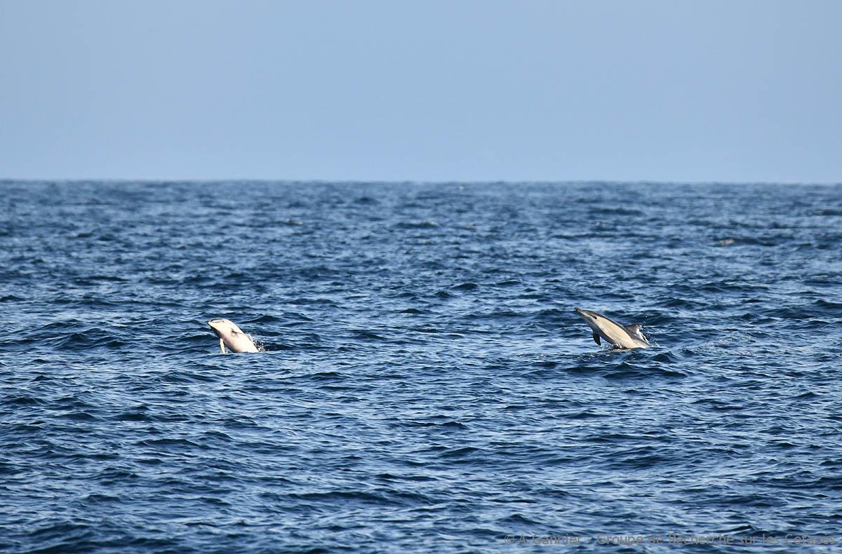 D’ailleurs les chasses de thons sont très nombreuses, et on arrive à distinguer des bancs de petits anchois. Est-ce la raison de la présence des dauphins communs sur le plateau ? Non moins surprenante, la présence proche de groupes importants de Dauphin bleus et blancs Stenella coeruleoalba, une espèce que nous observions les années passées en général sur des profondeurs approchant ou dépassant les 1000 mètres.