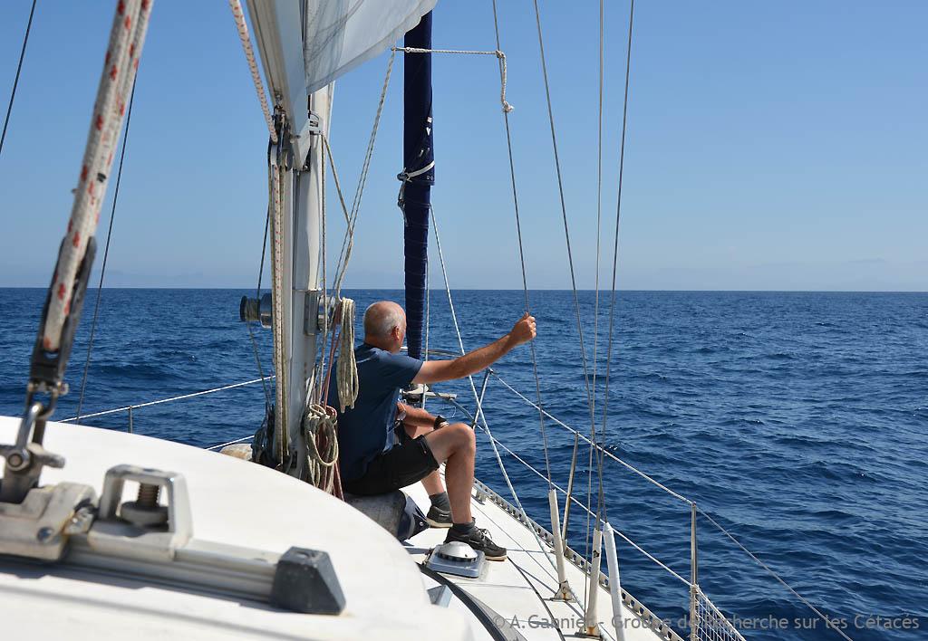 Les Ziphius font également partie de notre quotidien, dès que les conditions de mer le permettent. Le 11 août en particulier, notre attention est attirée par d’énormes gerbes d’écume visibles à l’horizon : après vérification aux jumelles et photographies, les auteurs de ces méga-splashs sont deux Ziphius qui se livrent à un concours de sauts, plus de 10 pour l’un d’eux. Pour quelle raison ?… Nous n’en savons rien.