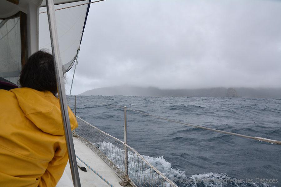 La météo marine n’est pas très propice aux observations naturalistes durant cette deuxième semaine d’août : nous devons faire avec une houle quasi-permanente, qui tutoie parfois les 3 mètres. Et certains jours, on se demande si on ne va pas voir apparaître le Cap Horn entre deux passages de pluie et de brume !