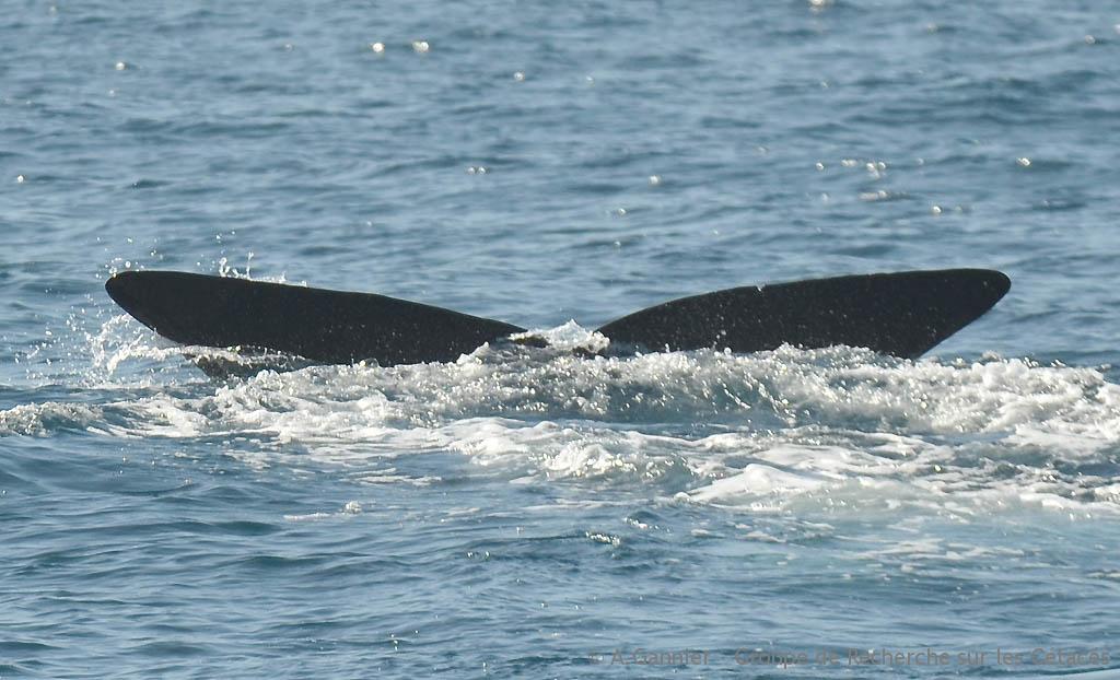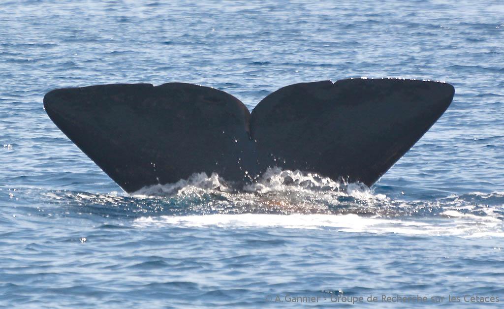 Le Cachalot est l’une des espèces qui se prêtent le mieux à la photo-identification grâce à son habitude de montrer généreusement sa caudale à chaque sonde de chasse. Pour cette raison, les travaux qui exploitent la photo-identification de cette espèce sont nombreux, y compris en Méditerranée. Le GREC n’est pas en reste, qui avait inauguré les recherches sur le Cachalot dès 1998, avec la thèse de Violaine Drouot-Dulau. Une des premières découvertes issues de la photo-Id avait été en effet que maître Physeter n’obéissait pas en Méditerranée au paradigme écologique valable en océan : les mâles rendent visite aux femelles même en plein été. Sacrés Don Juan !