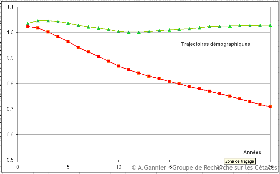 A partir d’une population à l’équilibre sur 25 années, on considère que la mortalité anthropique par pêche touche 1% des adultes chaque année. L’effet de ce supplément de mortalité annuelle est une baisse de la population de la région Atlantique de 30% à peu près au bout de 25 ans, chute de population qui se poursuit dans les décennies suivantes. Le critère européen (ASCOBANS, OSPAR) de bon état de ‘conservation’ serait donc enfoncé au bout de 25 ans, car l’objectif officiel d’une politique de bonne ‘conservation’ consiste à maintenir la population à 80% de son niveau optimal au bout de 100 années (*).