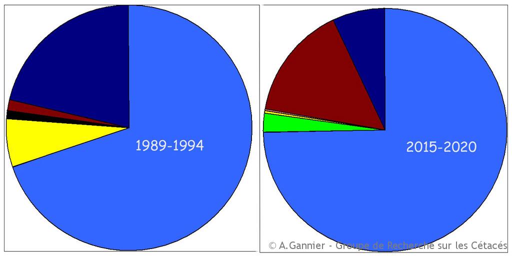 Deux espèces ont quasiment disparu ou se sont raréfiées : le Dauphin de Risso et le Rorqual commun … et deux autres espèces sont (ré)apparues ou sont (re)devenues communes : le Cachalot et le Grand dauphin.