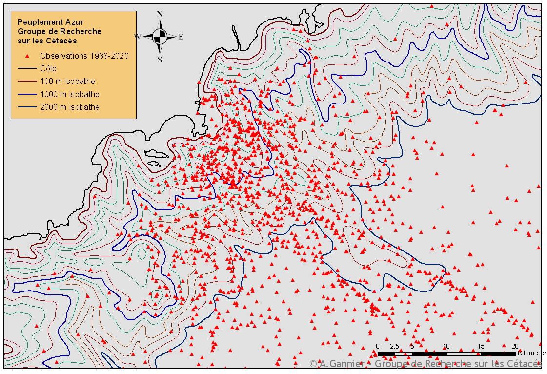 Il avait fallu auparavant faire parler les données de prospection du Groupe de Recherche sur les Cétacés : pas moins de 20 000 km de prospection répartis sur 32 années, avec 821 observations de 7 espèces (eh oui … pas de Dauphin commun dans la région, du moins dans nos fichiers). Au milieu de pas mal d’incertitudes, car le tableau reste un puzzle aux nombreuses pièces manquantes, une conclusion s’est dégagée : le peuplement azuréen de cétacés a changé.