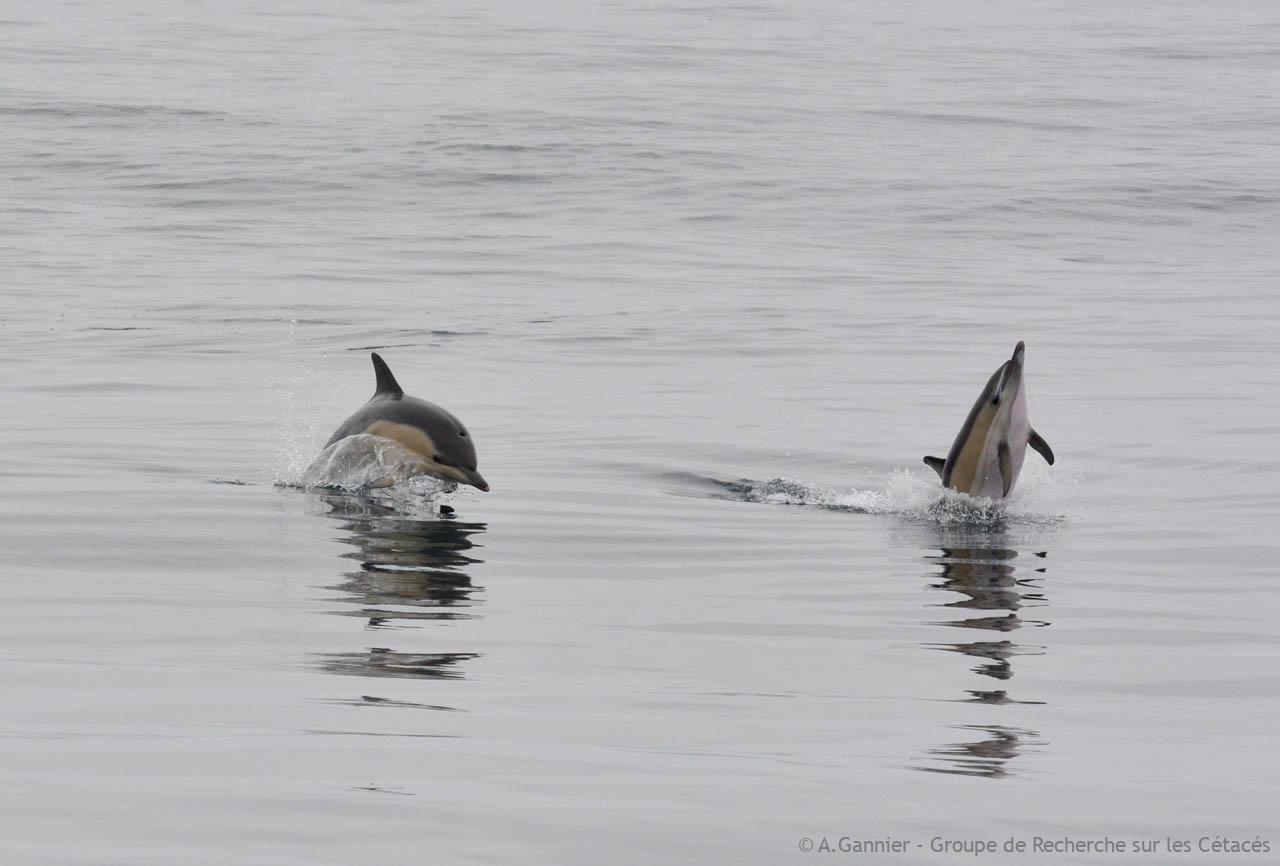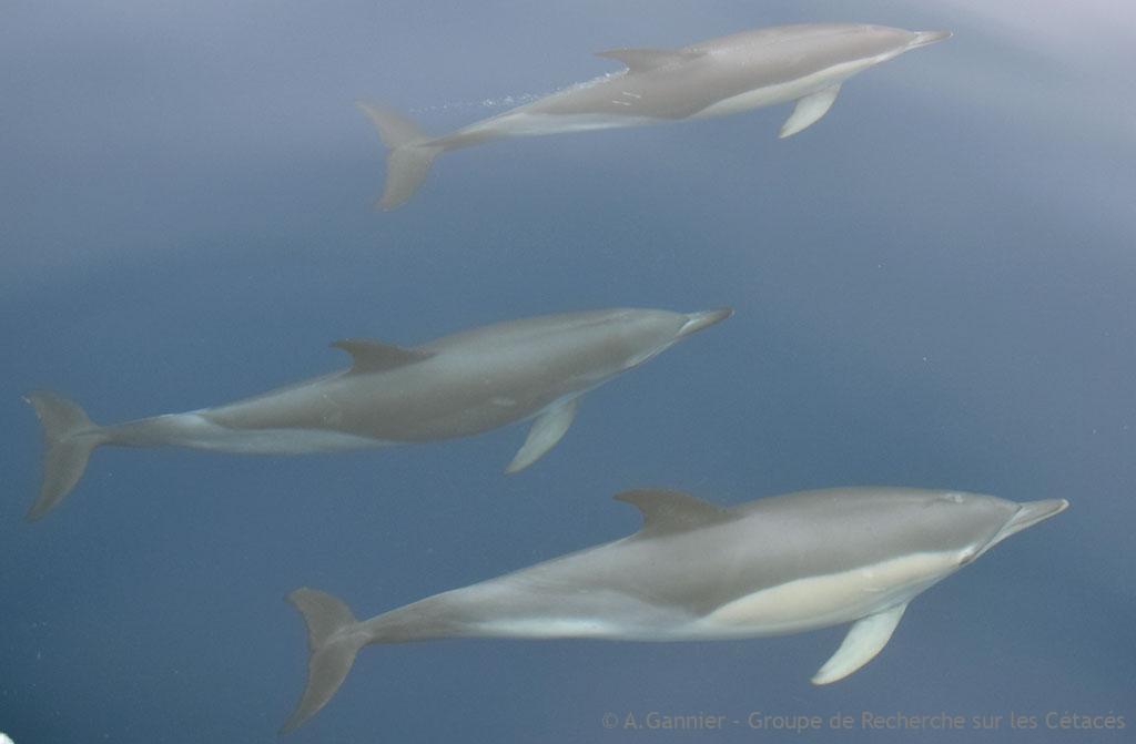 Le Groupe de Recherche sur les Cétacés a recensé en mer, entre 1992 et 2022, plusieurs centaines de groupes de dauphins communs, à bord de voiliers de taille modeste, particulièrement une unité de 12 mètres. Parmi ces observations, 185 ont été qualifiées d’assez « qualitatives » (durée suffisamment longue, météo suffisamment bonne, distance suffisamment proche) pour être analysées : cela représente 42 groupes en Méditerranée, et 143 en Atlantique, dans trois zones : les Açores, la côte ibérique, le golfe de Gascogne. Grâce aux clichés pris pendant ces observations, nous avons pu dénombrer 13 occurrences d’animaux ne présentant pas la pigmentation habituelle en sablier.