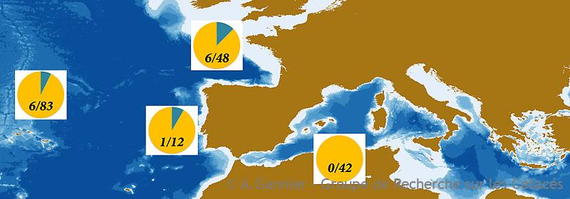 Les résultats de l’analyse montrent que les dauphins mélaniques ne sont pas observés en Méditerranée (0 mélanique sur 42 observations de dauphins communs) ; en revanche, en Atlantique, 7% des groupes de Delphinus delphis comportaient un tel individu aux Açores (6/83), 8,5% sur la façade ibérique (1/12), et 12,5% dans le Golfe de Gascogne (6/48) ; soit une moyenne assez stable pour l’Atlantique. Cette différence entre les deux grandes régions peut indiquer l’existence de populations présentant des différences génétiques de part et d’autre du détroit de Gibraltar.