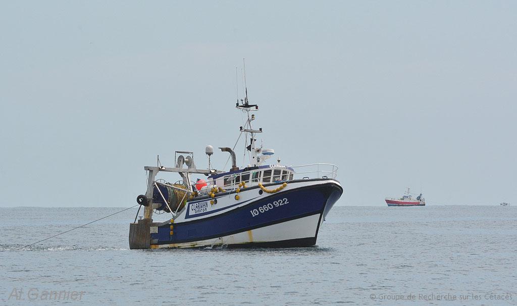 Autre intérêt des sorties : observer les activités de pêche. On sait que le GREC est fortement investi sur la problématique des captures dans le golfe de Gascogne. Nous voyons beaucoup de chalutiers par endroits, mais il y a si peu de cétacés que les risques de captures sont heureusement des plus réduits.