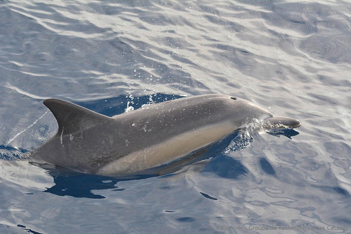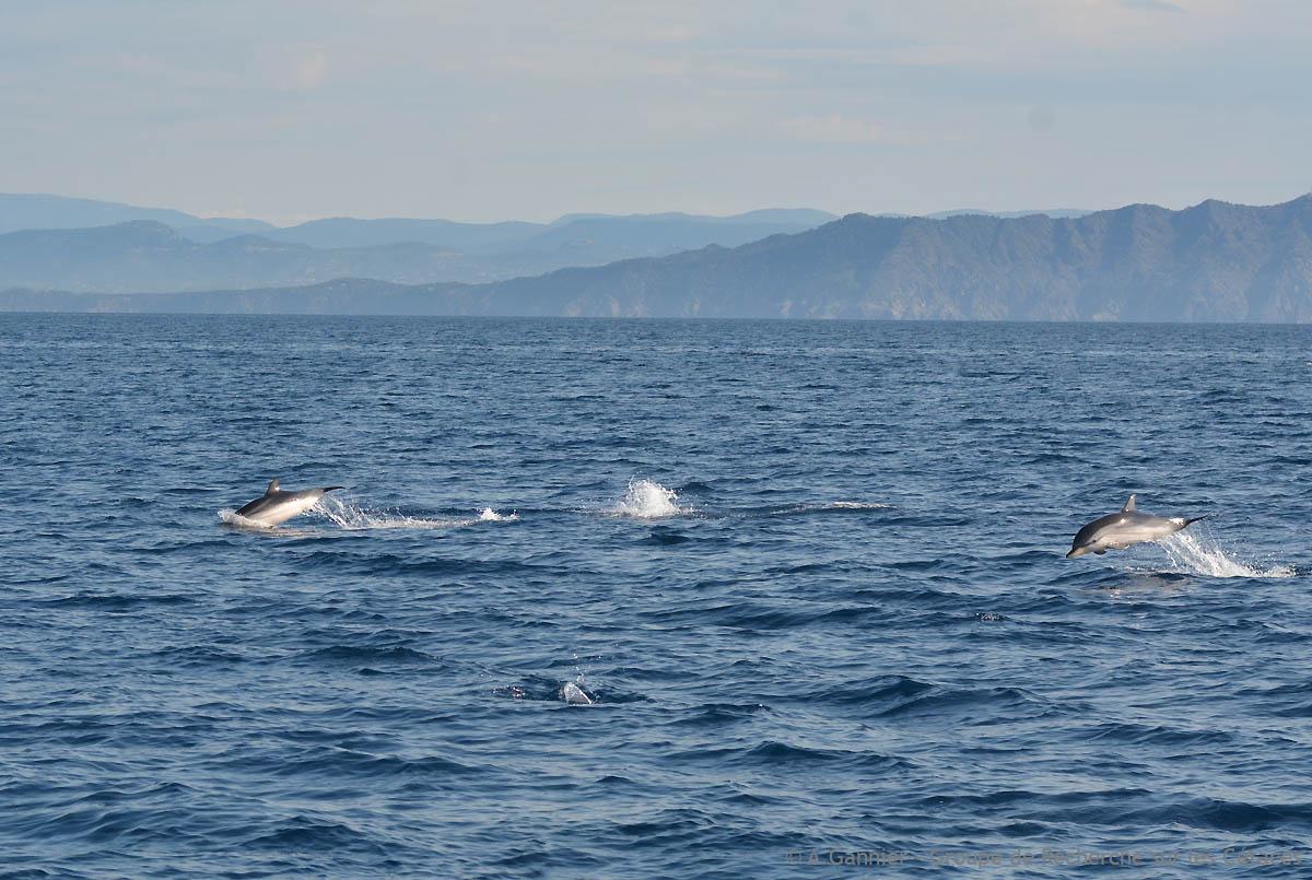 Deux groupes de Stenella présentaient la particularité de comprendre quelques Dauphins communs, lesquels ne sont jamais les derniers à venir ‘prendre’ l’étrave du voilier. Une position honorifique lorsque des dauphins viennent jouer au bateau. Les Delphinus sont encore assez rares dans le nord de la Méditerranée.