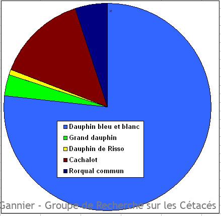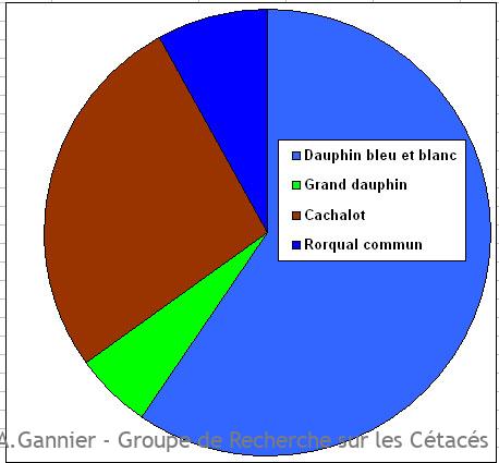 Les Dauphins bleus et blancs étaient là dans une proportion moindre qu’attendue, 59% des observations, et le Cachalot a été souvent rencontré (27% des obs.). De plus, nous n’avons vu aucun Stenella en zone côtière (moins de 3 milles des côtes) : ils étaient majoritairement plus au large, d’ailleurs en groupes assez importants (44 individus par groupe en moyenne).
