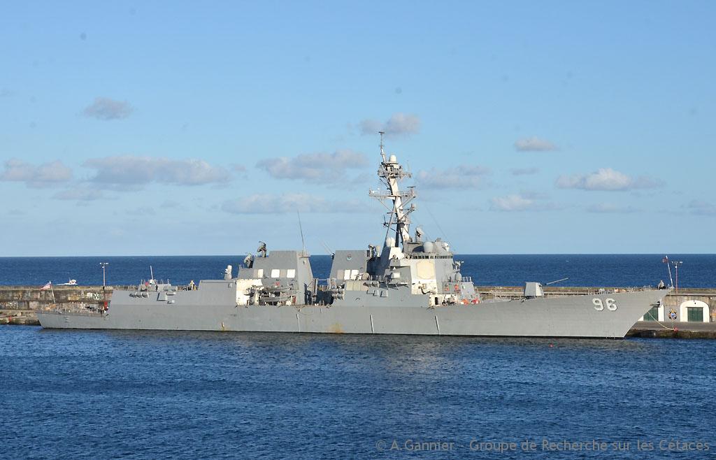 En effet, une plongeuse a posté sur facebook une vidéo qui contient la signature sonore d’un sonar (lien posté avec l’accord de Sophie Lina, que nous remercions). Les destroyers du type Arleigh Burke ont sous leur étrave un engin énorme (on ne peut pas le voir sur la photo du journal) : un sonar qui émet de longs pings à moyenne fréquence pour chercher les sous-marins.